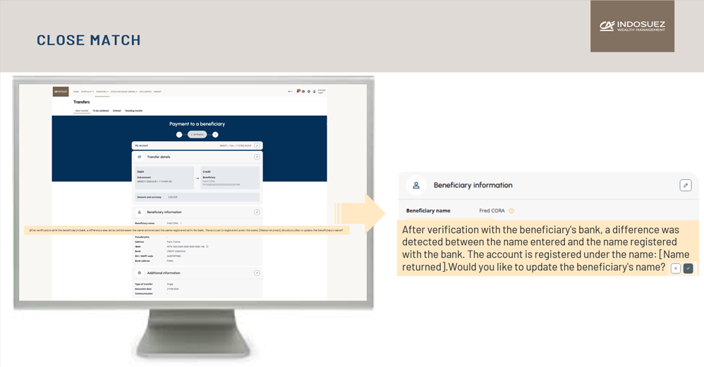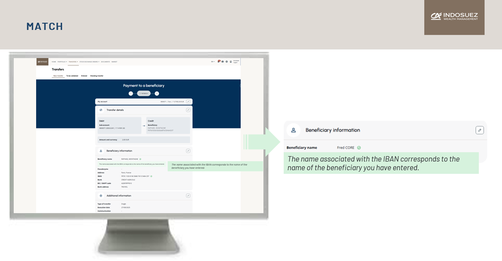 Before approving a transfer, the system checks that the name, first name or company name of the beneficiary entered corresponds to the bank account (IBAN) entered.