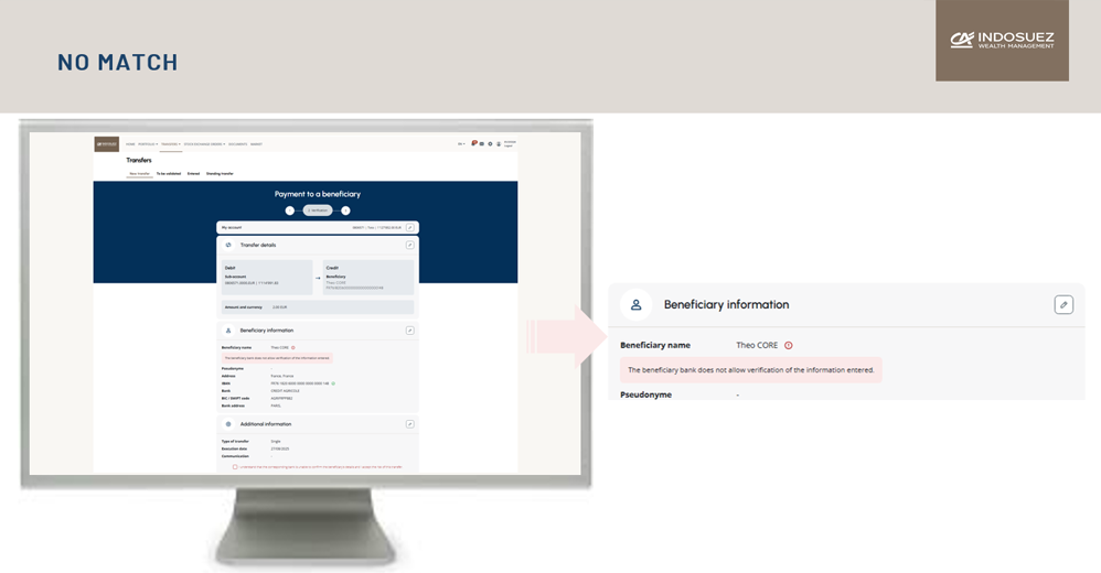 - No match: the name you entered does not match the IBAN name at all à An alert message will appear. It is strongly recommended to verify the information before taking any action. You can still validate the transfer, but at your own risk.